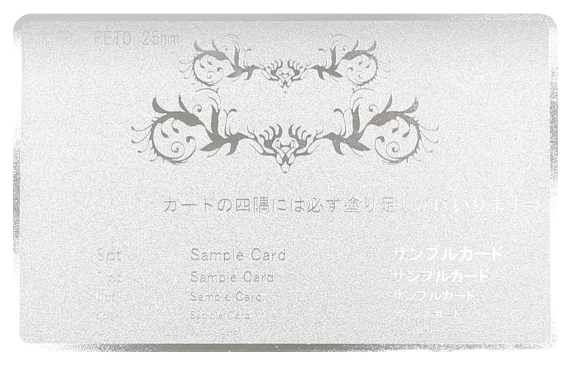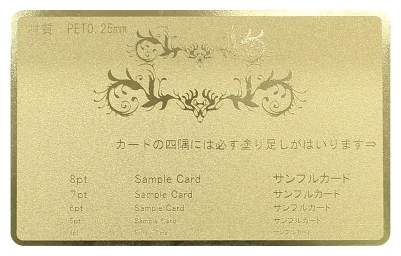 エッチングカードはPET素材に金か銀の箔を貼り付けて、デザインやテキストをシルク印刷をします。