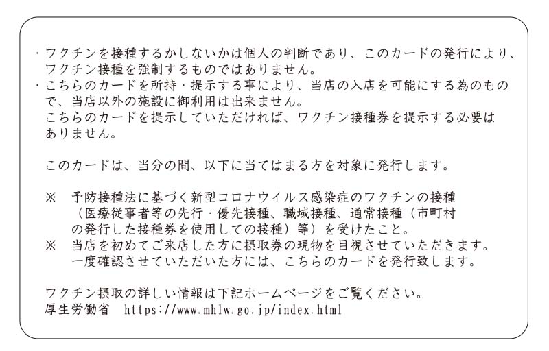 ※例えば、初来店したお客さまから、国から発券された接種券の確認した方にこちらのカードを渡せば、二回目以降の来店の際の確認が容易になるメリットがあります。