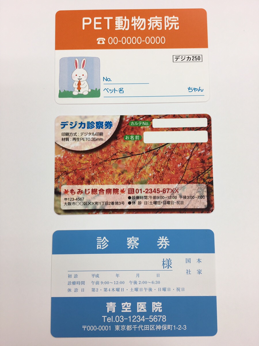 クリスパーカードは、病院の診察券として需要が高いカードです。クリスパーカードは標準的なカードサイズで厚みは0.25mm、表面がマットなためカードに直接文字を書くことができ、来院者の氏名や予約日を記すのにとても便利です。