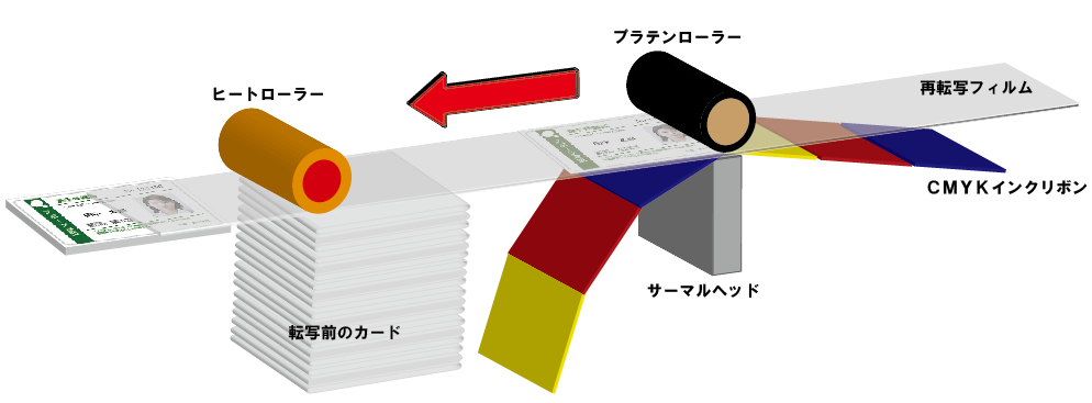 まず透明なオーバーフィルムの裏からCMYKリボンで転写をし、そのフィルムを印刷していない白いカードに熱圧着させる方法です。