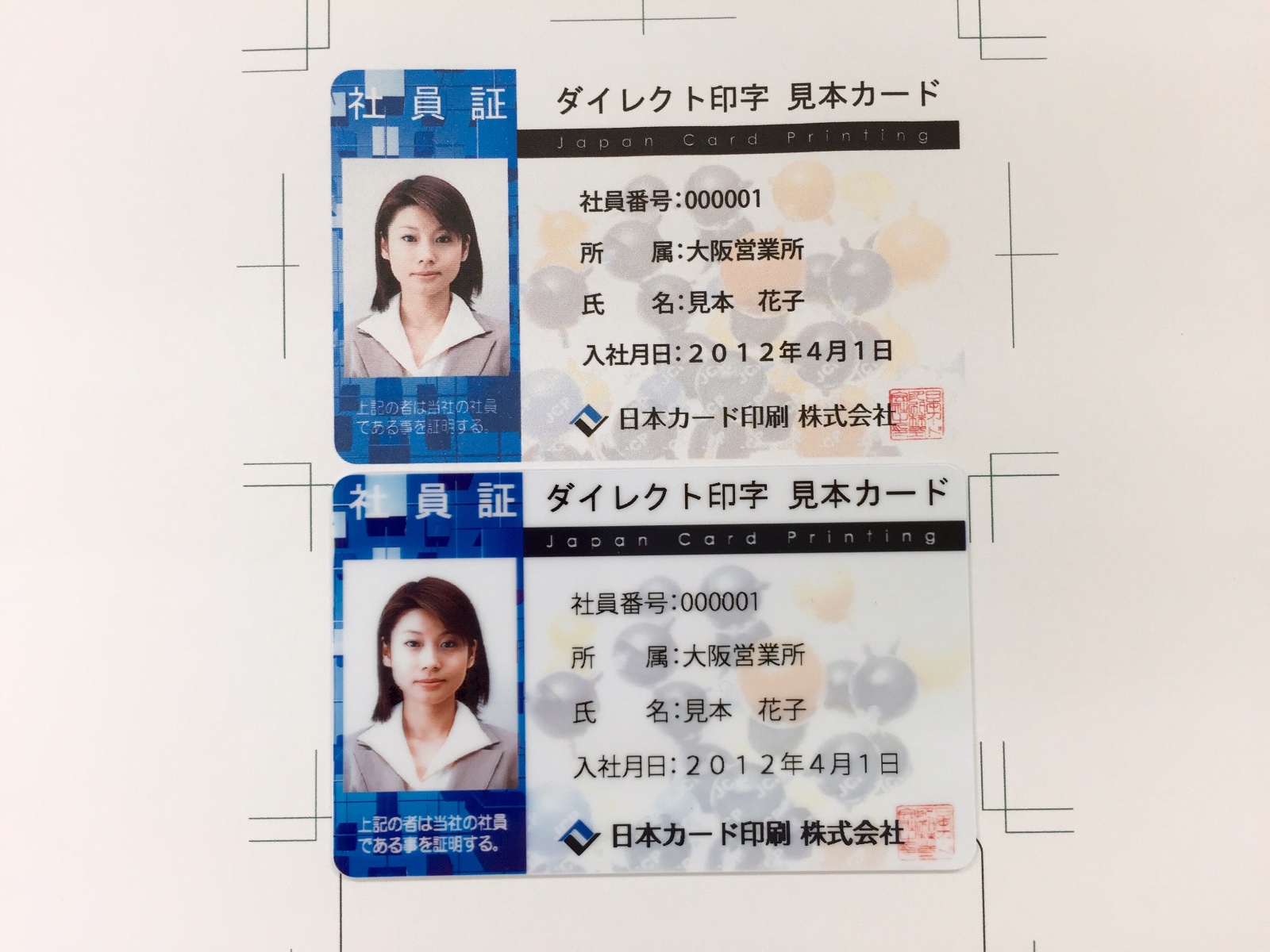 「ベースカード+昇華転写加工」ですと、ベースカードを作成するためにコストはかかりますが、色の表現は良くなります。しかし、社員証など少ロットでの作成の場合は、コストが見合わずに「白カード+ダイレクト印字(全面昇華転写加工)」を選ばれることがありますが、こちらの印字方法ですと色の出方に違いが出てきます。