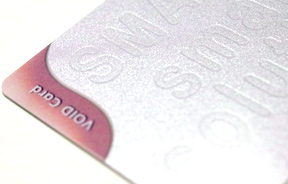 カード内部、オーバーシート内に特殊な厚盛りのシルク印刷をすることで、立体的なイメージを印刷しています。粘土に型を押し付けると文字や柄が凹むのと同じ要領です。通常のインクの量では出来ない厚盛り印刷ならではの表現方法です。