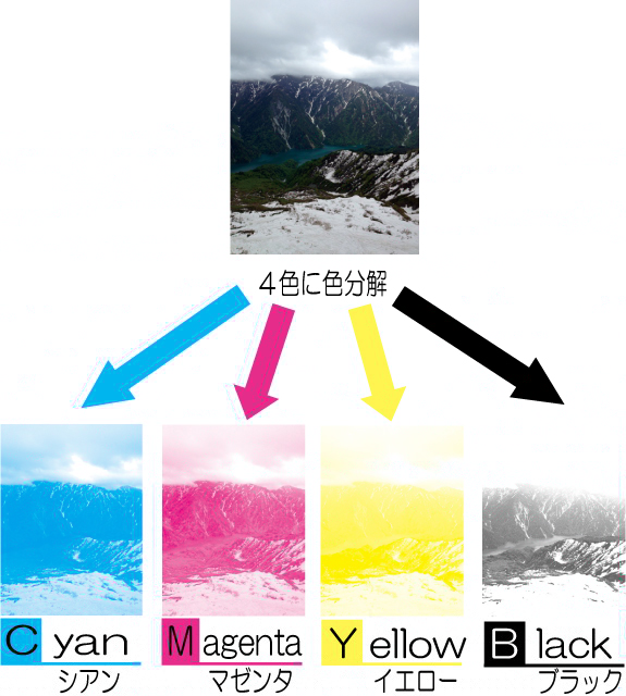 4色分解とは、印刷するフルカラー原稿を、印刷の基本色であるCMYKに分けることです。紙やカードに印刷する際は、上記4色に分解した後、それぞれの色のインクを順に重ね合わせて印刷していきます。